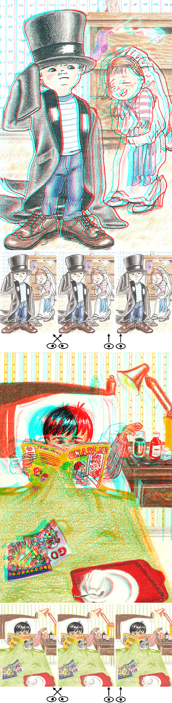 A few months ago I showed 2D to 3D conversions of Van Gogh and Rembrandt images. The most recent Stereoscopy's cover was a conversion of a portrait of Van Gogh, and inside is an article I wrote about doing such conversions. This week I'm keeping it in the family, showing conversions of two of my wife Betsy's note card designs, "All Grown Up" and "Get Well Soon." To do them I sent the images to my cellphone, converted them with DepthMaker, Masuji Suto's 2D to 3D conversion android app.