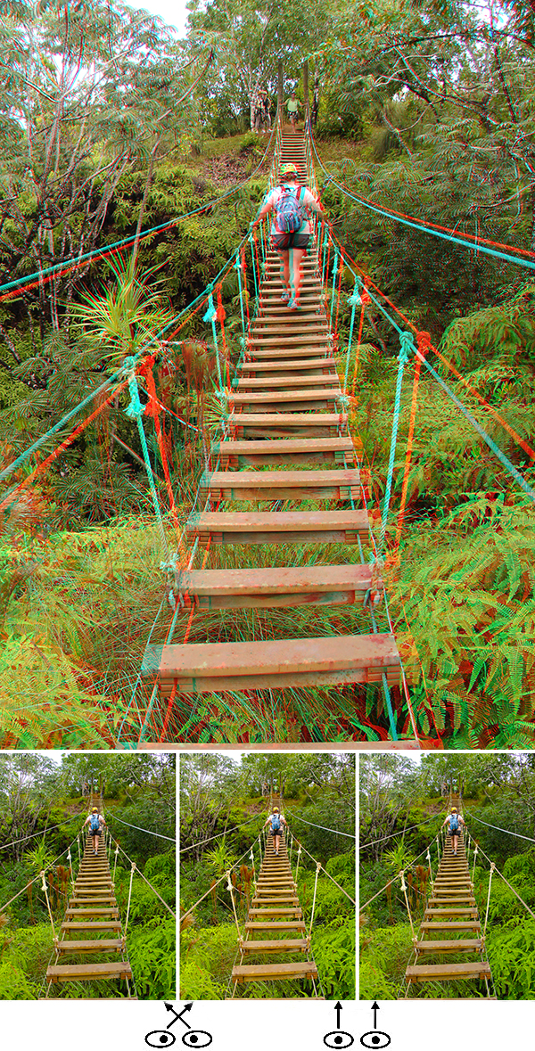 This is a shot of Betsy several years ago on a suspended rope bridge over a canyon in Hawaii. I don't recall the exact location but I believe it was on Kauai or Maui. We've not been to Hawaii since well before Covid hit, so feeling we're overdue for a trip there. It was shot with a Fuji W3 and auto-aligned in StereoPhoto Maker.