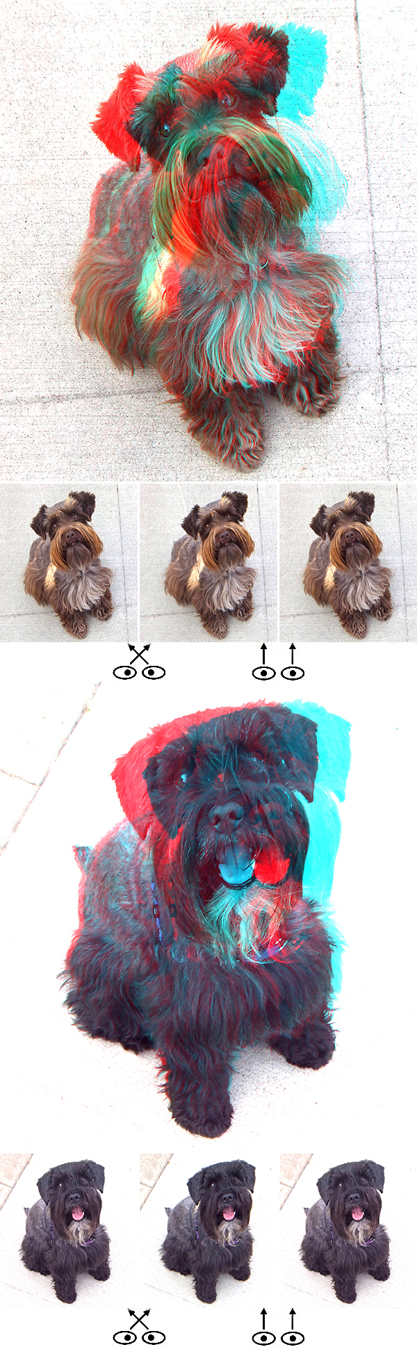 Winnie (above) and Indy (below) are miniature schnauzers who live one block away. Frequently in the late afternoon I hear Winnie's high pitched bark as she approaches our yard, making her presence known and telling me to come to the fence with some treats. I took these shots with my Fuji W3 and turned them into phantograms by approximating a rectangle (trapezoid in the photo because of effects of perspective) on the right eye shot and matching up corner pixels on the left eye shot.